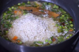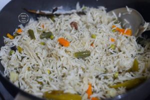 - Cook covered on medium flame for 4-5 mins and then reduce the heat, continue cooking covered for 10-12 mins until the rice is soft & cooked.