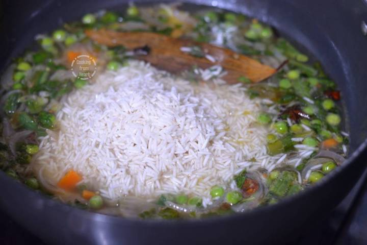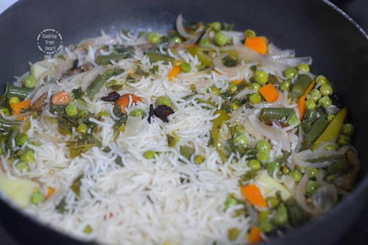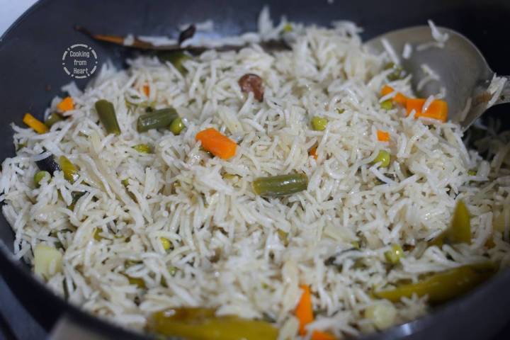 - Using a heavy pan to cook the pulao results in better rice texture. Cook the rice and vegetables in medium heat for 5 mins and thereafter reduce the flame to low, cook covered of 10 mins.