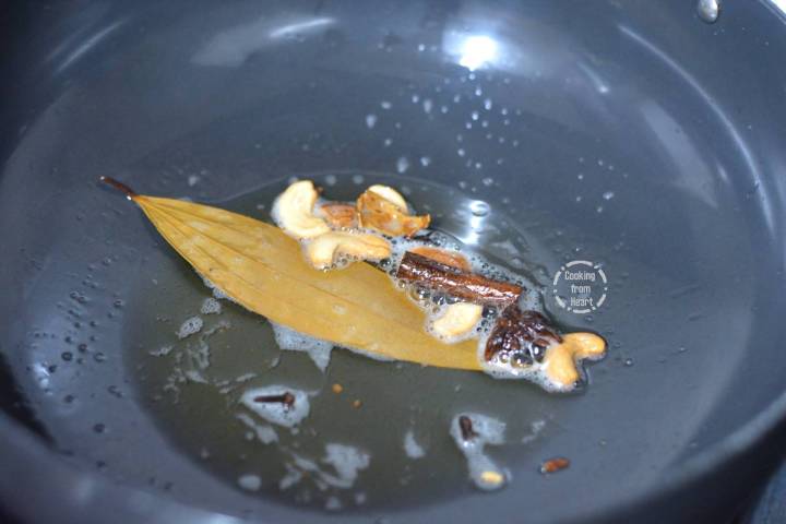 - First wash and soak 1 cup basmati rice in 2 cups water. In a heavy pan heat 1 teaspoon ghee and 2 teaspoon oil. Add whole spices – 1 dry bay leaf, 2 cloves, 2 green cardamoms, 1 cinnamon stick, 1 star anise, 1 mace flower and 6-8 cashews. Fry until cashews are golden brown.