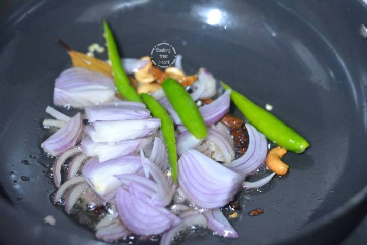 First wash and soak 1 cup basmati rice in 2 cups water. In a heavy pan heat 1 teaspoon ghee and 2 teaspoon oil. Add whole spices – 1 dry bay leaf, 2 cloves, 2 green cardamoms, 1 cinnamon stick, 1 star anise, 1 mace flower and 6-8 cashews. Fry until cashews are golden brown.