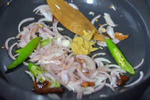 - Add 2 green chillies slit cut along with 1 large onion finely sliced.