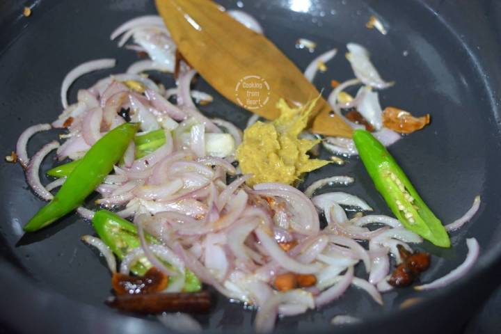 - Fry onions until translucent and add 1 teaspoon ginger garlic paste. Cook for 2-3 mins until there is no raw smell.