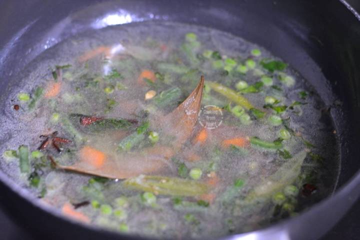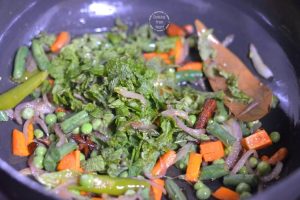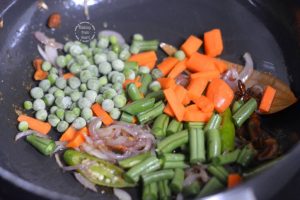 - Next add ½ cup mixed vegetables chopped (1 small carrot, 4-5 french beans, 1 small potato and handful of green peas – fresh/frozen).