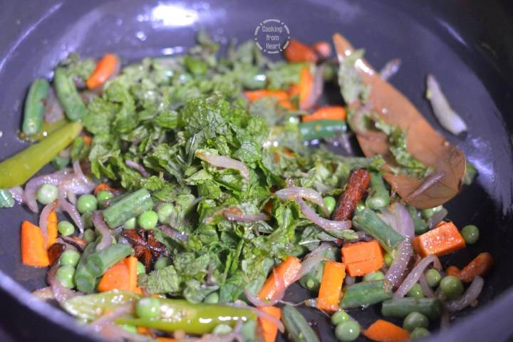 Cook for 3-4 mins and then add ¼ cup finely chopped mint leaves. Cook for another minute.
