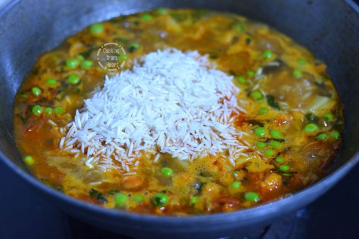 - Close the pan with a lid and cook on low flame for 12-15 minutes. Switch off the heat and let it rest for 5-10 mins before opening it. Fluff up the rice.