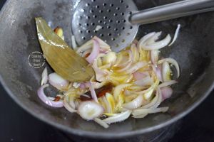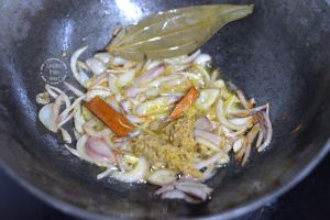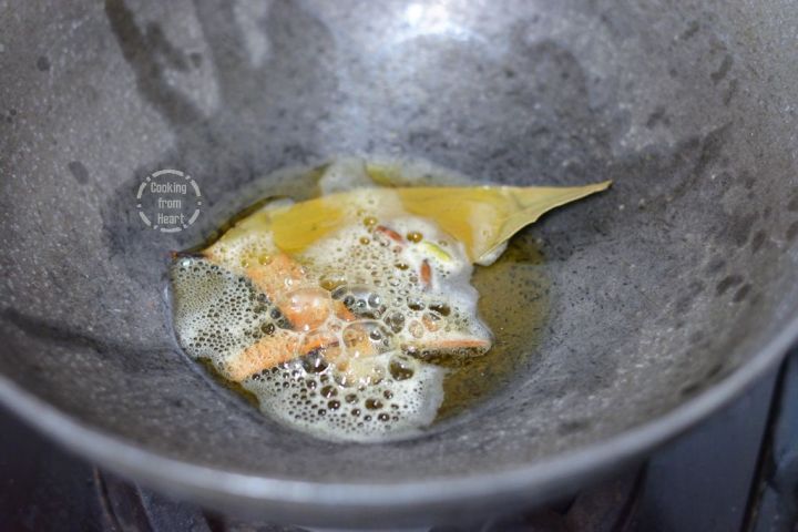 In a heavy bottomed pan, heat 2 teaspoon oil and 2 teaspoon ghee. Add one dried bay leaf, 2 cloves, 1 cardamom and 1 cinnamon stick. Fry for few seconds.