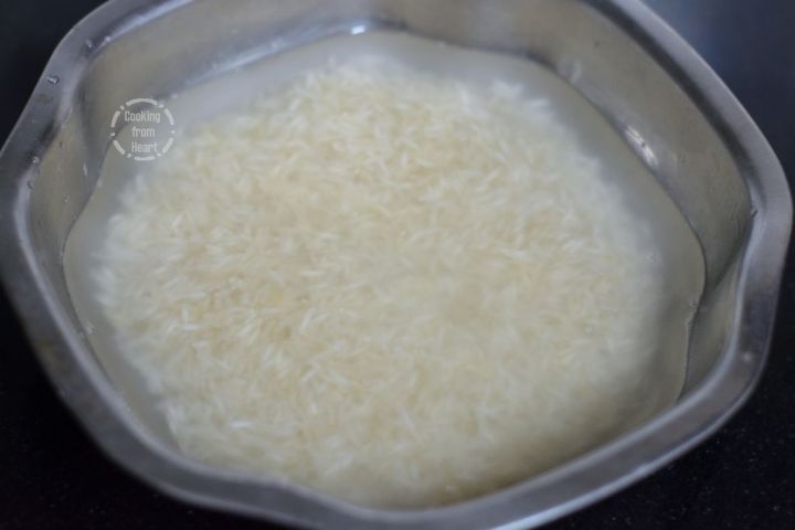 Wash and soak 1 cup basmati rice in 2 cups of water for 15-20 mins.