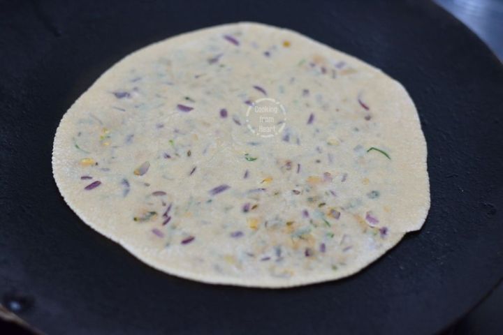 Meanwhile heat a cast iron pan/tawa for cooking the paratha. Place the paratha and cook on low flame.