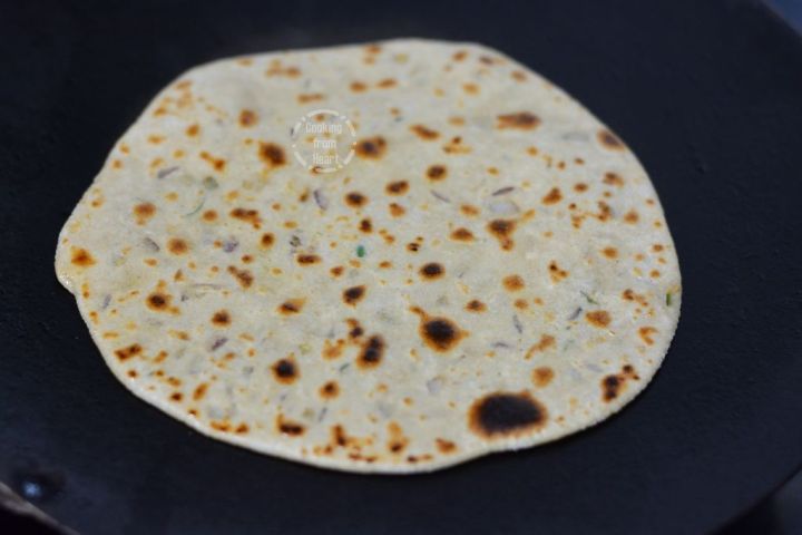 - Meanwhile heat a cast iron pan/tawa for cooking the paratha. Place the paratha and cook on low flame.