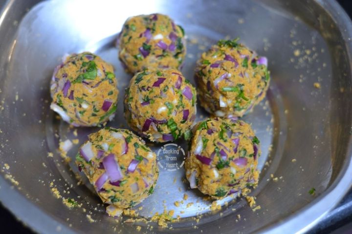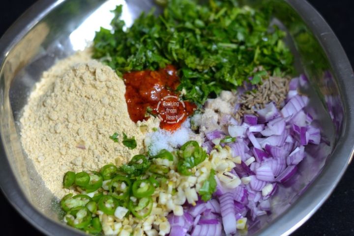 Finely Chopped Onions, Cilantro, Green Chillies, Fresh Ginger, Garlic are added to the sattu flour to add texture and flavor.