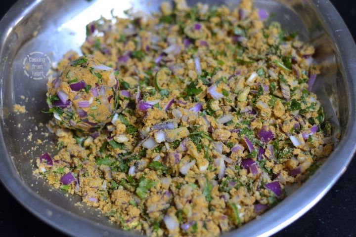 Mix everything well together. Drizzle 1 teaspoon lemon juice and bring the stuffing together. You should be able to make tight balls from the mixture.