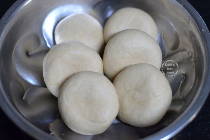Divide the dough into 6 large balls, equally sized. Roll the balls of dough between your palms to make it even and smooth.