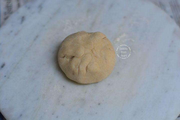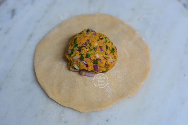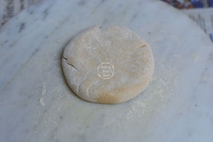 - Flatten the ball of stuffed dough and dust it in some whole wheat flour.