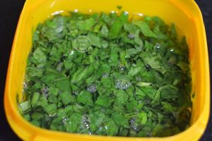 - Pour enough boiling water to cover 1.5 cups of roughly chopped spinach. In a minute, drain the water and add enough cold water. Drain off the spinach.