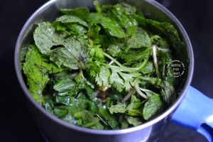 - Add blanched spinach along with ¼ cup of mint leaves & 1 cup of coriander leaves/cilantro to a blender.