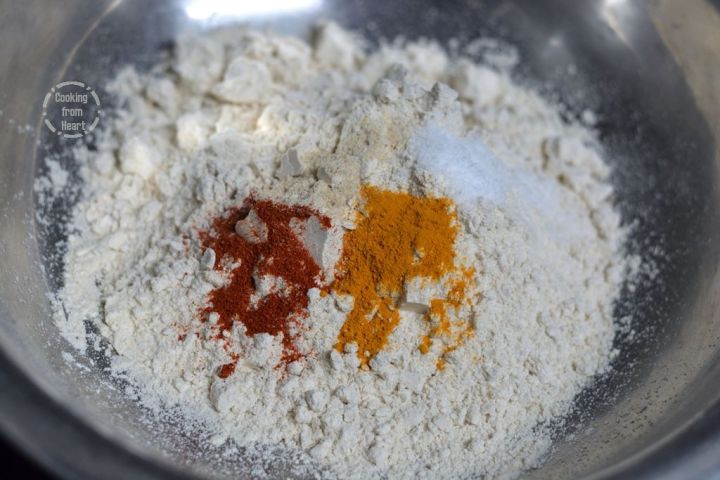 - In a mixing bowl, add 2 cups whole wheat flour, ½ teaspoon red chilli powder, ¼ teaspoon asafoetida, ¼ teaspoon turmeric powder, salt as needed.