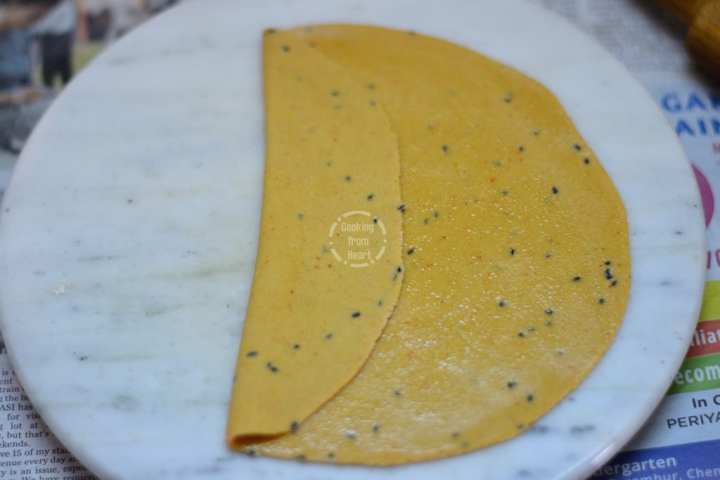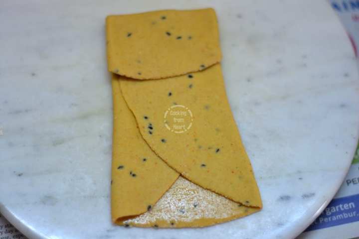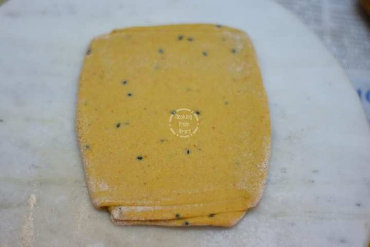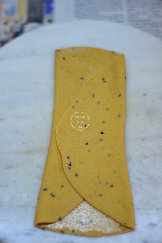 - Finally fold at the center so that the dough looks like a folded kerchief.