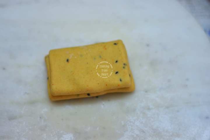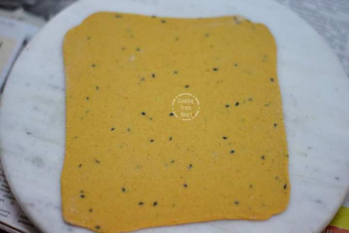 - Dust it slightly with flour and roll into a square, keeping up with the shape. Roll equally on all sides to get the square shape.