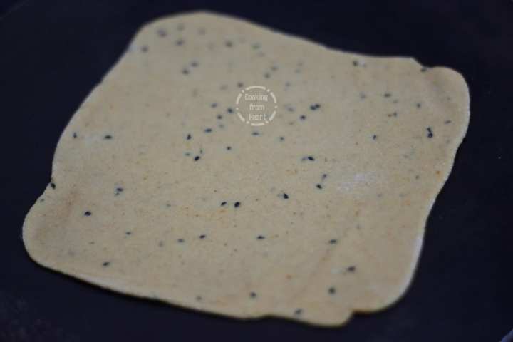 12. Heat a tawa/flat pan. Gently put the rolled out Masala Paratha and cook it until tiny bubbles appear on the surface.
