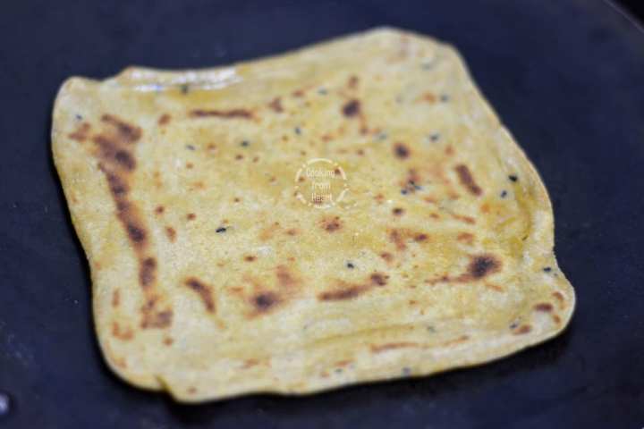 - Heat a tawa/flat pan. Gently put the rolled out Masala Paratha and cook it until tiny bubbles appear on the surface. Flip it to the other side and drizzle some oil.