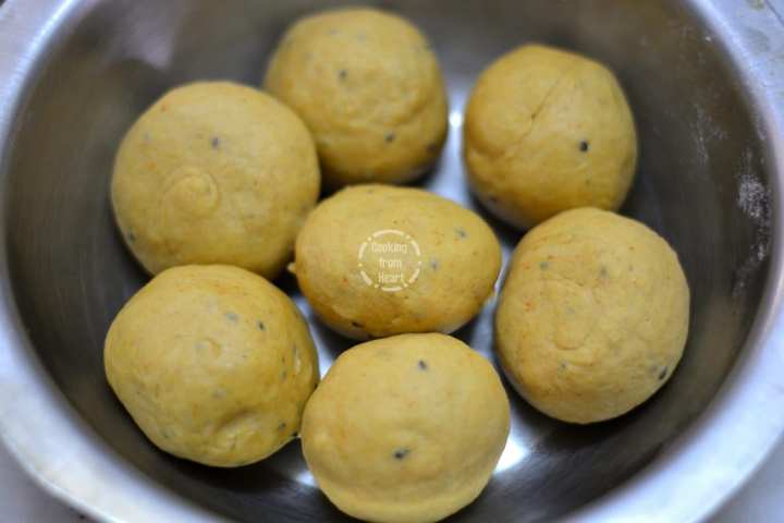 2. Divide the dough into 7 equal parts and make roundels.