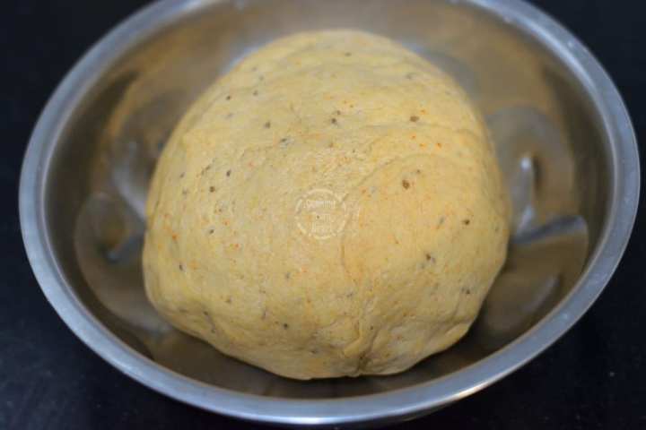 1. Add wheat flour, ajwain, red chilli powder, turmeric powder, salt and mix it well. Add water little by little and knead into a smooth pliable dough.