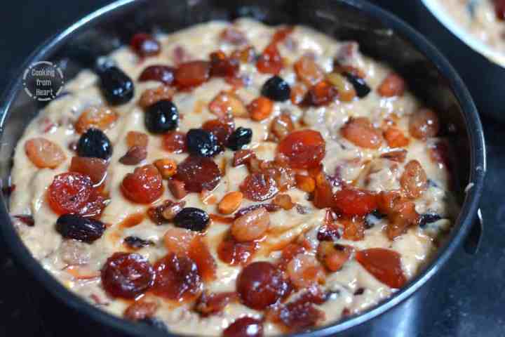 - Next add 2 cups of the rum-soaked fruits. Reserve 1-2 teaspoon for topping the cake.