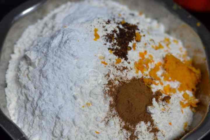 - In a mixing bowl, add all the dry ingredients – 1.5 cups all-purpose flour, 1 teaspoon baking powder, ½ teaspoon baking soda, 1 teaspoon orange zest (optional), ½ teaspoon cinnamon powder, ¼ teaspoon nutmeg powder and ¼ teaspoon clove powder.