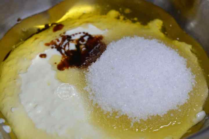 - In another mixing bowl add ⅓ cup oil, ½ cup fresh yogurt/curd, 1 teaspoon vanilla extract and ½ cup sugar.