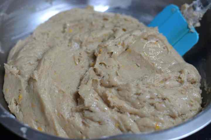 In a mixing bowl, add all the dry ingredients – 1.5 cups all-purpose flour, 1 teaspoon baking powder, ½ teaspoon baking soda, 1 teaspoon orange zest (optional), ½ teaspoon cinnamon powder, ¼ teaspoon nutmeg powder and ¼ teaspoon clove powder.