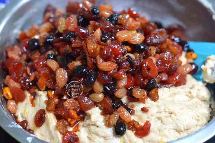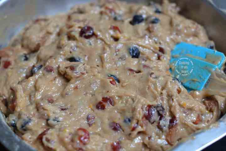 Next add 2 cups of the rum-soaked fruits. Reserve 1-2 teaspoon for topping the cake.
