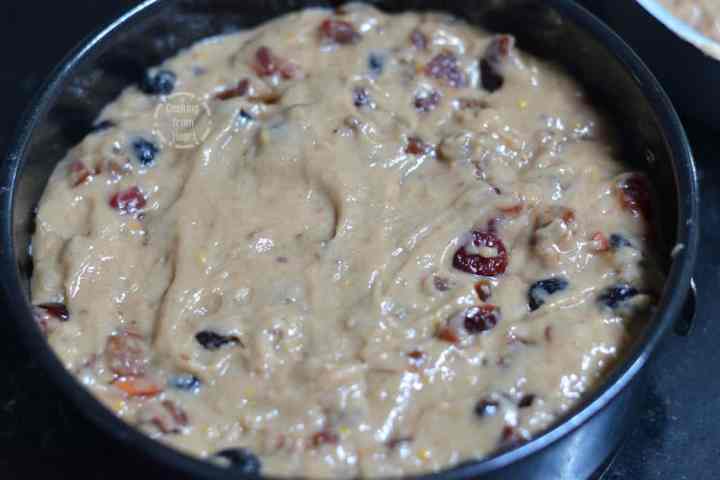Make sure all your baking ingredients are at room temperature. Even the soaked dry fruits mixture should be at room temperature when it is being added to the cake batter.
