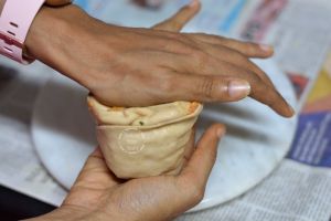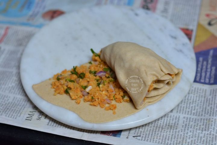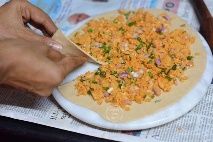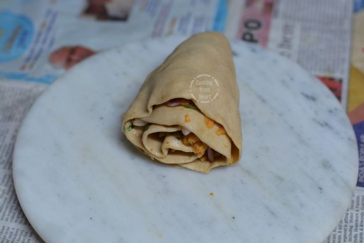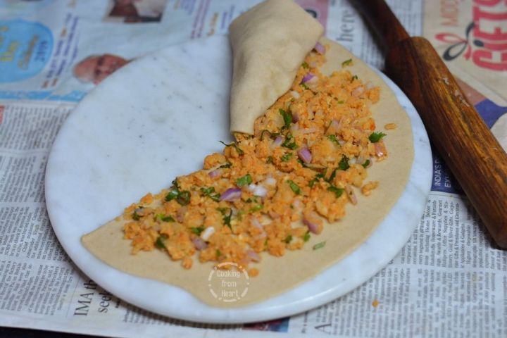 - Start rolling the paratha from the cut into a cone, as tightly as possible without spilling the stuffing.