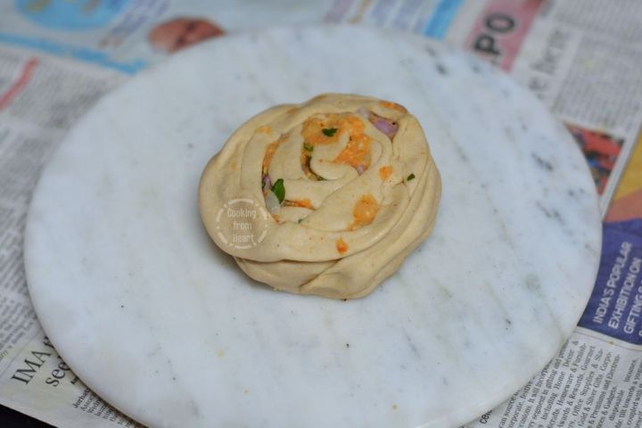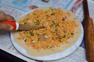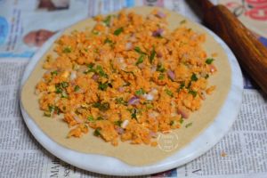 - Generously top it with the prepared stuffing, place it as evenly as possible.