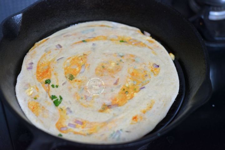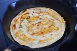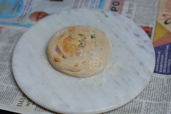 Meanwhile heat a cast iron pan/tawa for cooking the paratha. Place the paratha and cook on low flame.