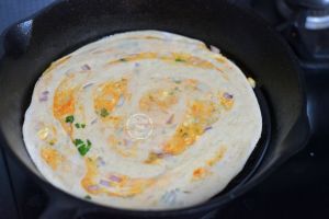 To make paratha, roll a ball of dough as thin as possible. Dust additional flour as needed to roll it. It doesnt have to be a proper round shape. Now apply ½ teaspoon oil all over the roti.