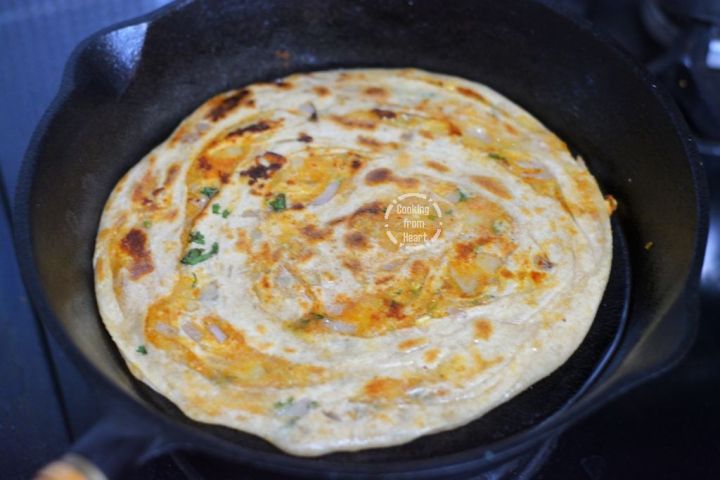 - Meanwhile heat a cast iron pan/tawa for cooking the paratha. Place the paratha and cook on low flame.