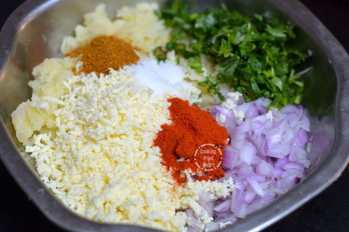 - To prepare the stuffing, in a mixing bowl add 1 cup boiled mashed potatoes, ½ cup grated paneer, 1 medium onion finely chopped, ¼ cup finely chopped coriander leaves, 1 green chilli finely chopped, ½ tablespoon Kashmiri red chilli powder, ½ teaspoon tandoori masala powder, salt as needed.