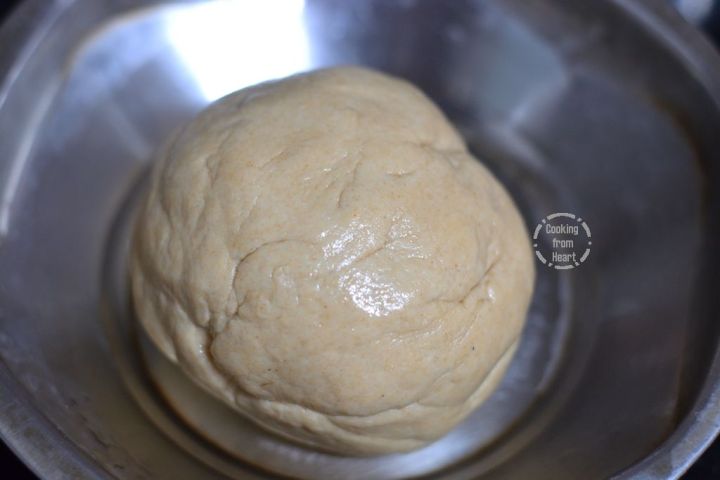 In a mixing bowl add whole wheat flour, salt as needed. Mix well. Add water little by little and knead it into a soft pliable dough. Knead the dough with the palm of your hand for 5-6 mins gently until it is soft. Add a teaspoon of oil on top and let it rest covered for 5-15 mins.