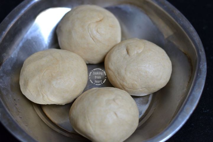 Divide the dough into 4 large balls, equally sized. Roll the balls of dough between your palms to make it even and smooth.