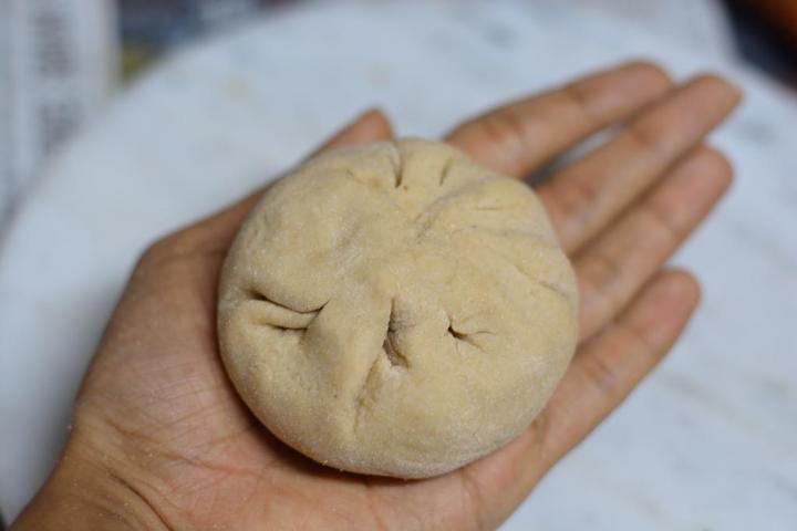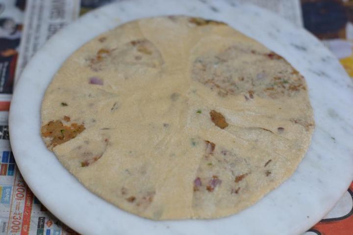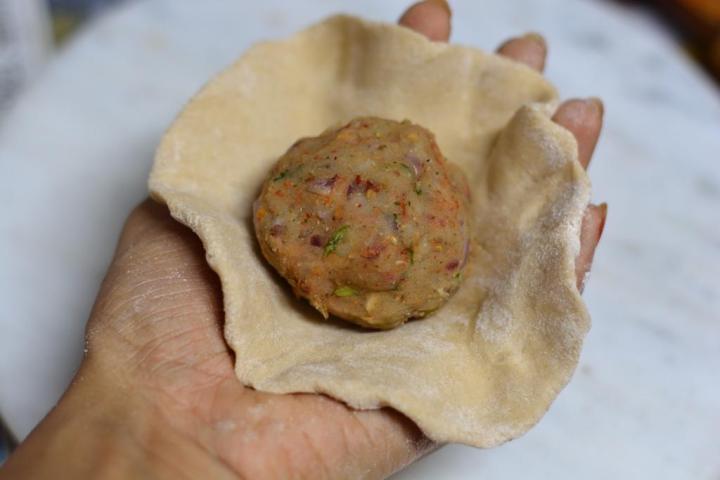 - Making a thick roti of smaller size just enough to fit the ball of stuffing.