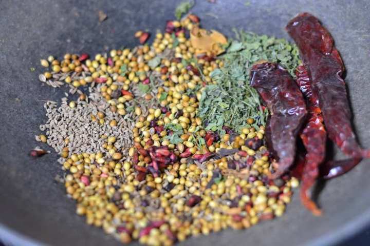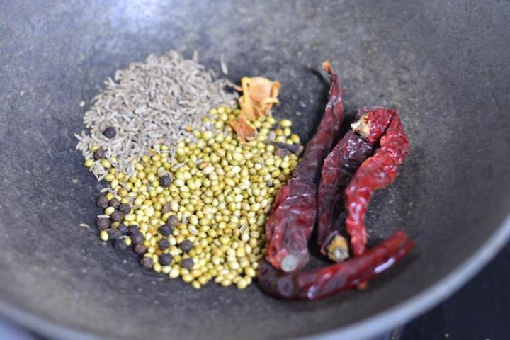 - In a pan dry roast 1.5 tablespoon coriander seeds, ½ tablespoon cumin seeds, ½ teaspoon black peppercorns, ½ mace, 2 cloves and 4 dried kashmiri red chillies until fragrant for about 3-4 mins on medium flame.