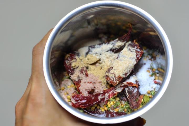 Once cooled down completely, add it to the blender along with ¼ teaspoon asafoetida, ¼ dried ginger powder, ¼ teaspoon black salt and ½ teaspoon salt.