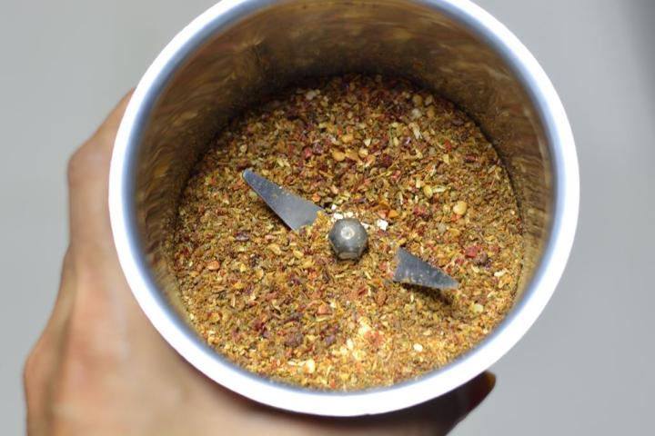 - Pulse a few times and grind into a coarse powder. Store in an airtight container (in fridge of longer shelf life)