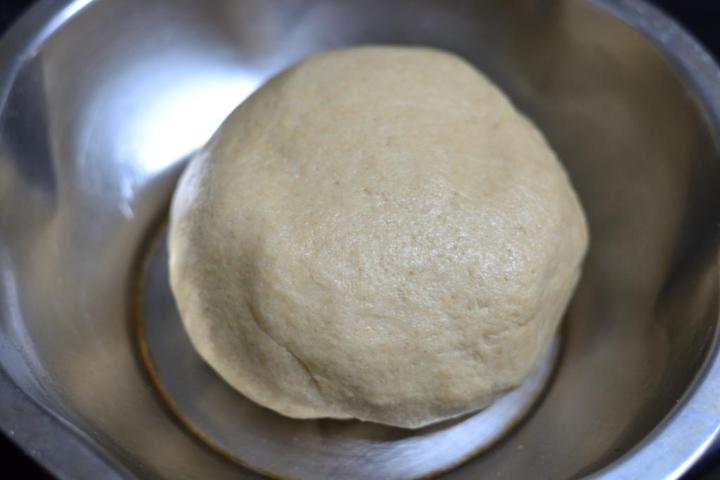 - In a mixing bowl add 1.5 cups whole wheat flour, salt as needed and add water little by little, knead into a smooth, soft, pliable dough. Add a few drops of oil on top and let it rest for 10-15 mins.