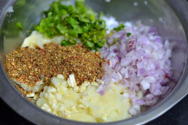 - In a mixing bowl add 4 medium sized mashed boiled potatoes, 1 medium onion finely chopped, 3 tablespoon finely chopped coriander leaves, 1 finely chopped green chilli and 2.5 teaspoon of paratha masala powder. Add salt (if needed) and ½ teaspoon red chilli powder (if using)