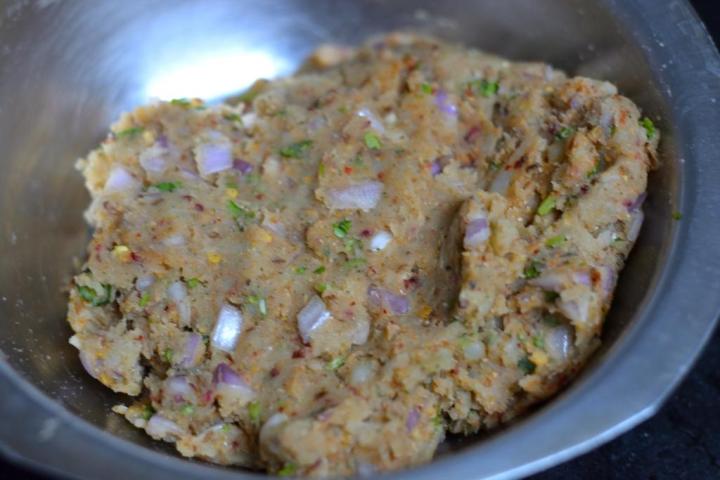 In a mixing bowl add 4 medium sized mashed boiled potatoes, 1 medium onion finely chopped, 3 tablespoon finely chopped coriander leaves, 1 finely chopped green chilli and 2.5 teaspoon of paratha masala powder. Add salt (if needed) and ½ teaspoon red chilli powder (if using)