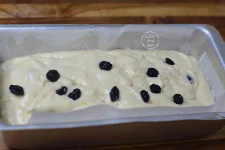 - Quickly transfer it to the greased & lined 10” loaf pan. Tap it gently to remove any air bubbles and even out the top. You can add some more dried blueberries on top if desired.