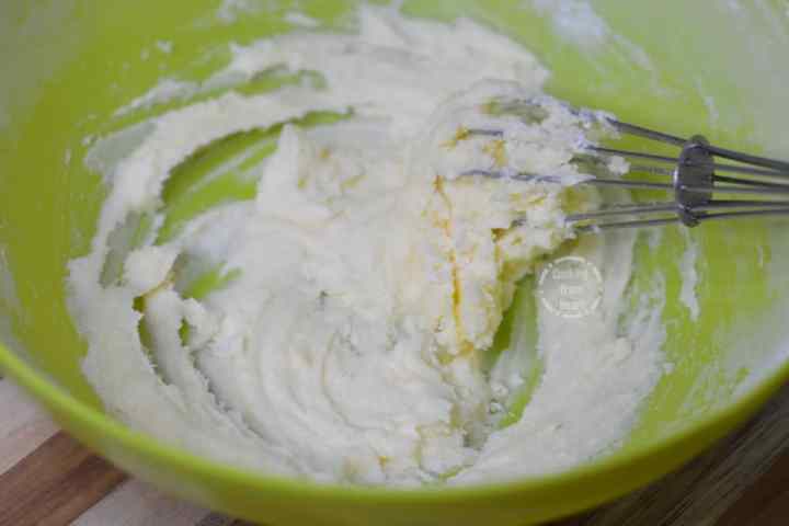 - In another mixing bowl add ⅓ cup butter (75 grams) at room temperature, ¾ cup powdered castor sugar. Beat it using a hand mixer or stand-up mixer until it is creamy.