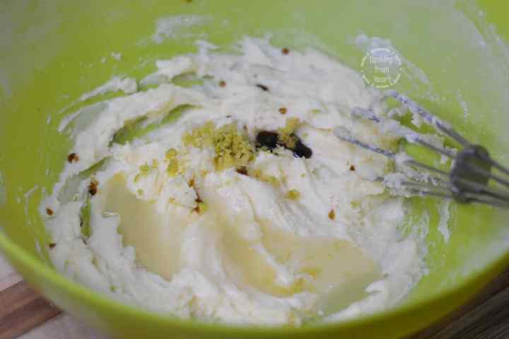 - Next add 2 tablespoon lemon juice, 3.4 teaspoon lemon zest and ¼ teaspoon vanilla extract. Beat again for a minute.
